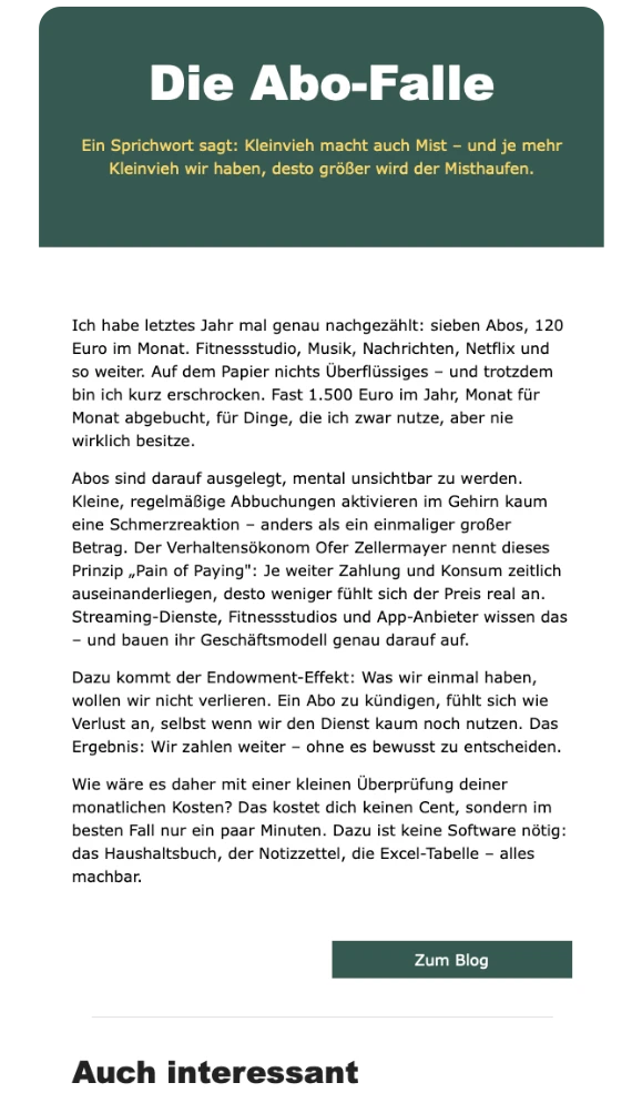 - Du erhältst eine Mail, wenn es etwas zu sagen gibt. Maximal 4 Mails pro Monat.